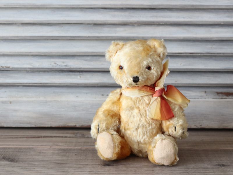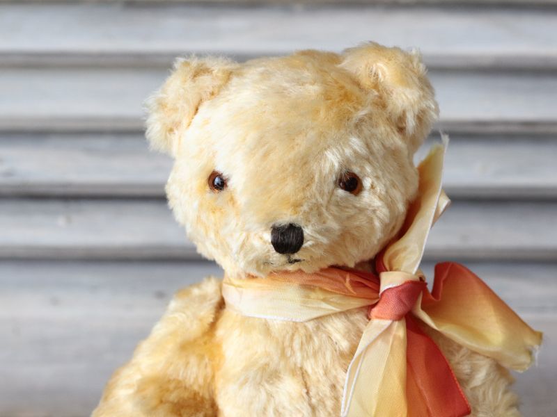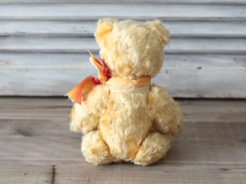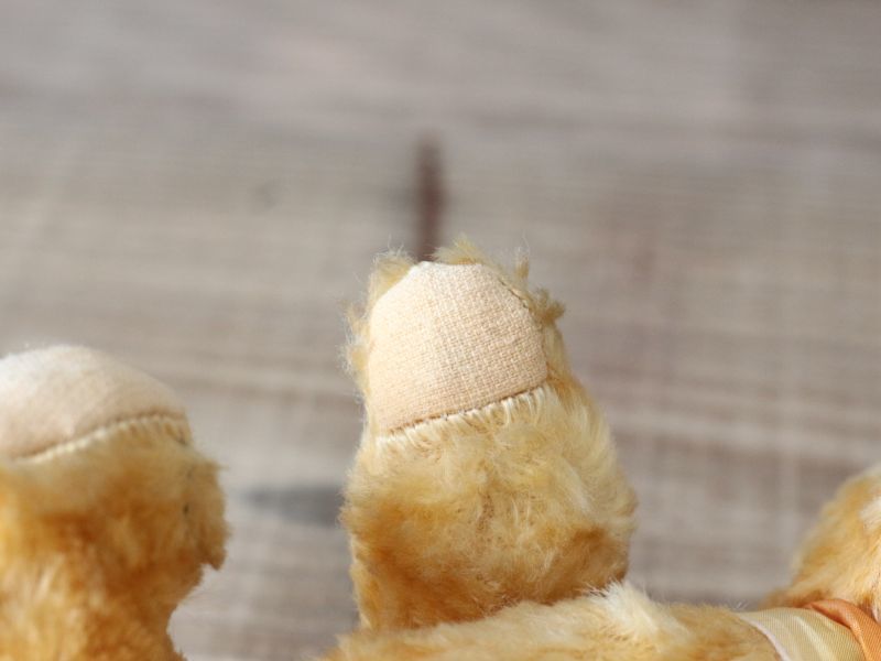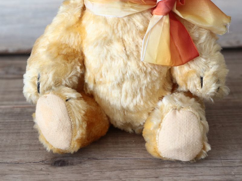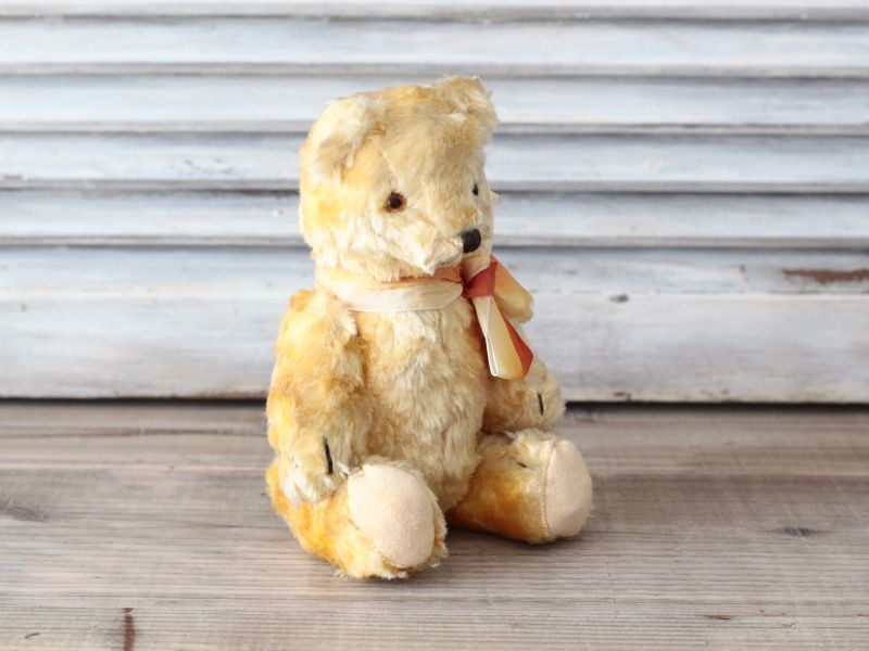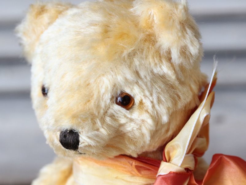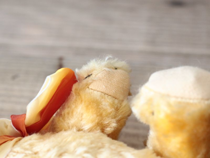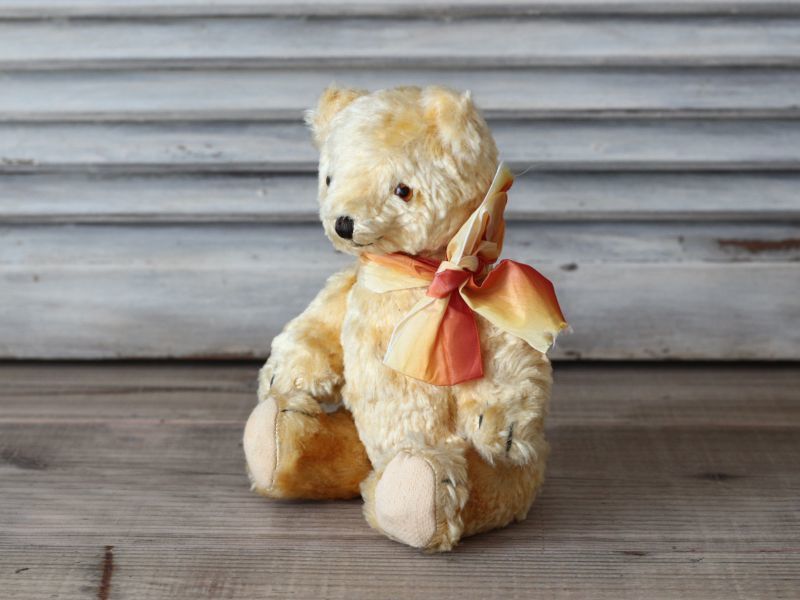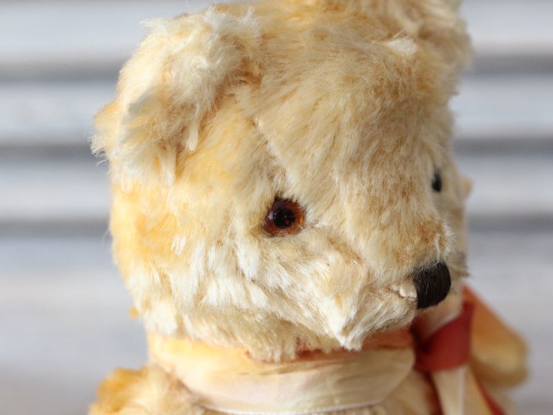 モヘアとお揃いの黄色いリボンに琥珀色のグラスアイ