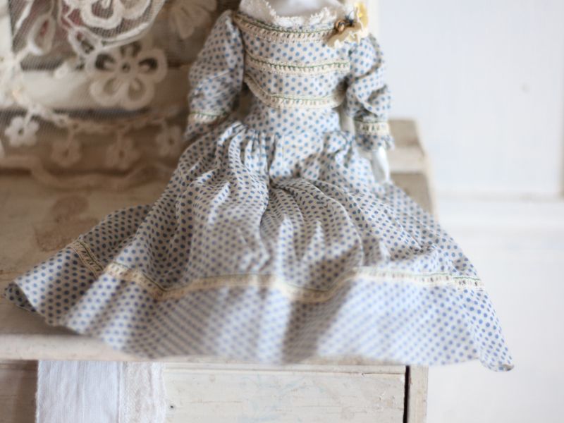 フラワーコサージュの着いたドレス、インナードレスにドロワーズを身につけています。