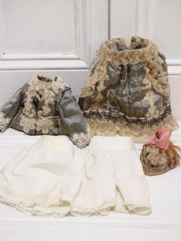 ブラウス、スカート、ペチコート、ドロワーズ、帽子を身につけています。