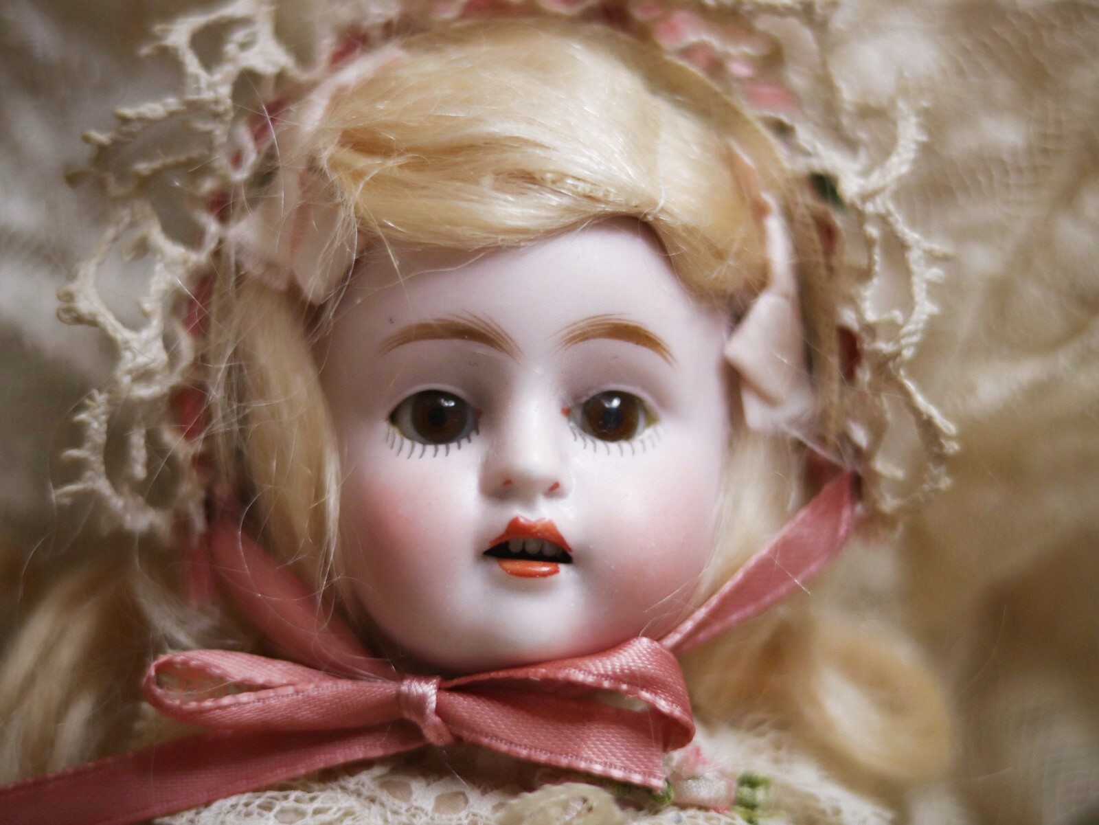 ボネ、ドレス、ドロワーズを身につけています。