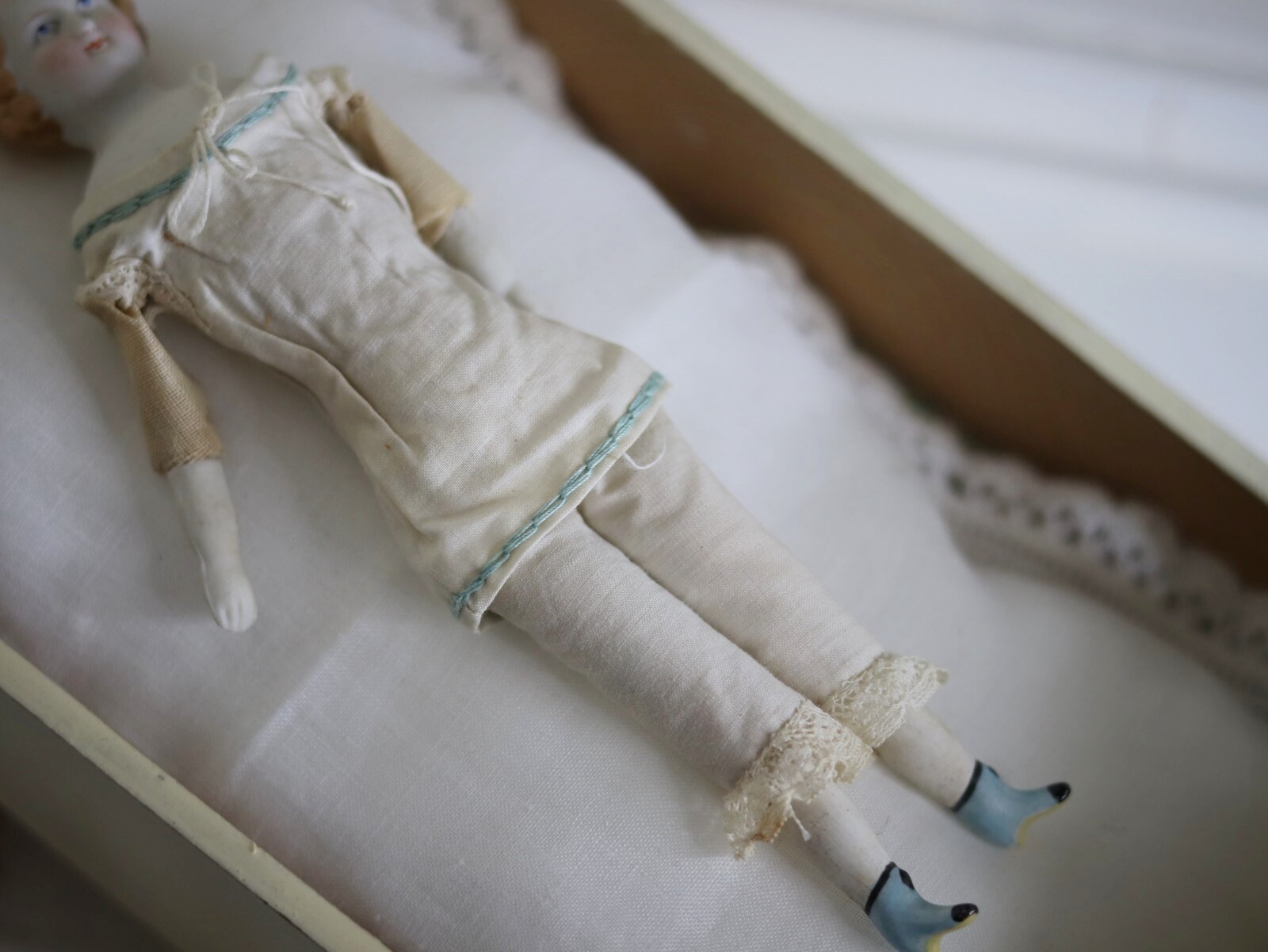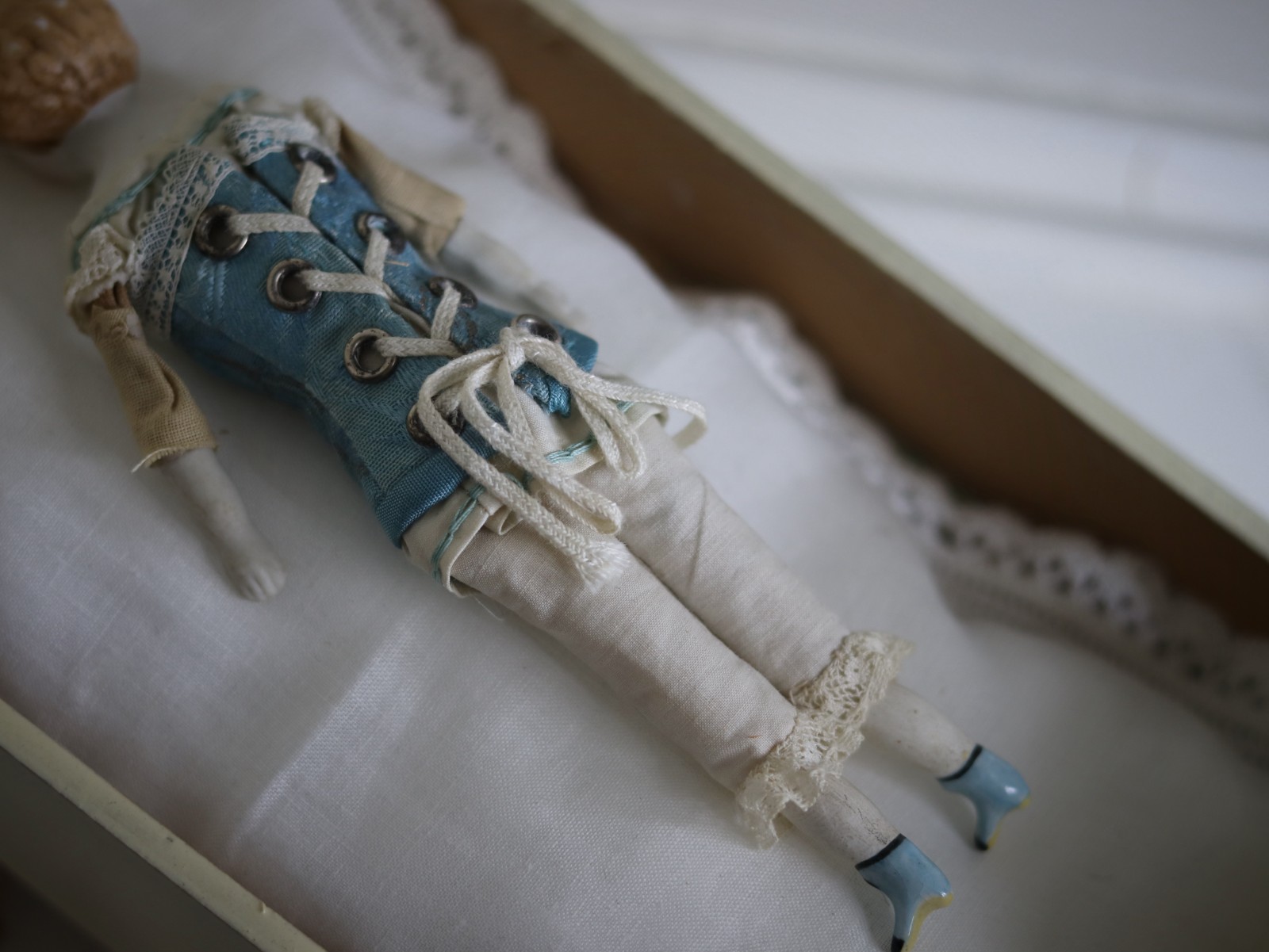 Victorian Blonde China Head Doll Wearing a Blue Corset