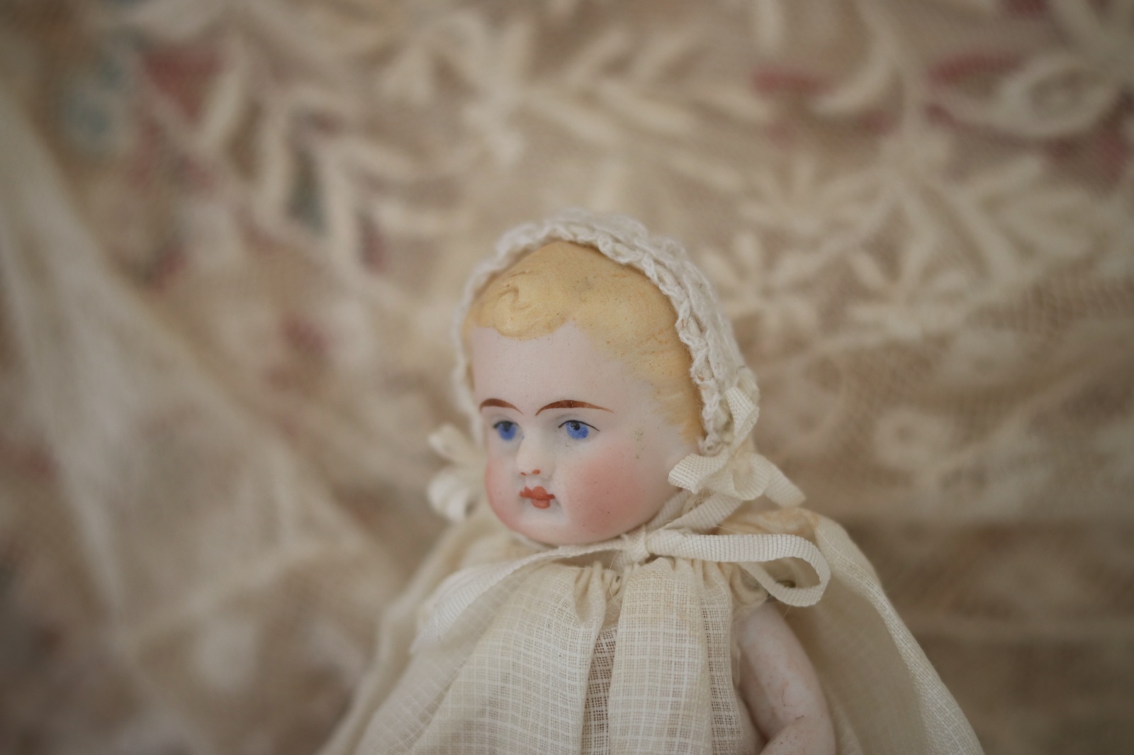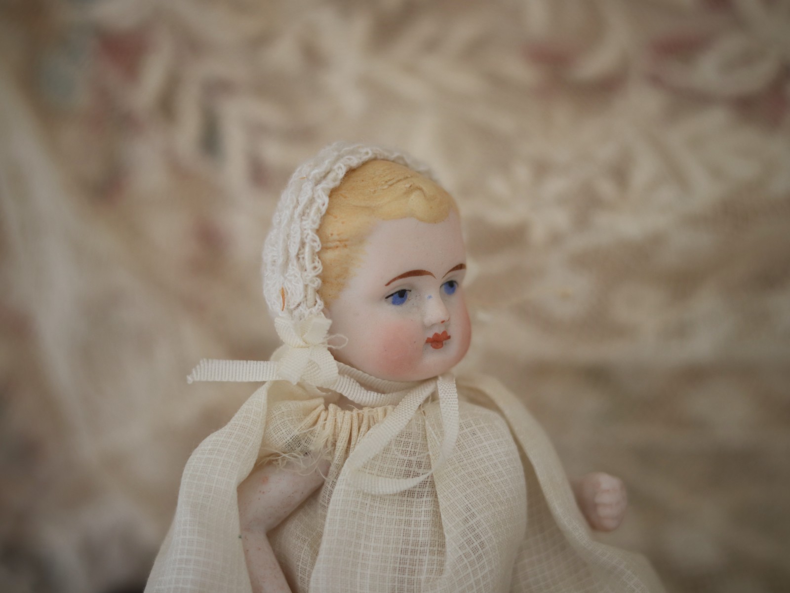 可愛いボネ、ドレス、ペチコート、ドロワーズを身につけています。