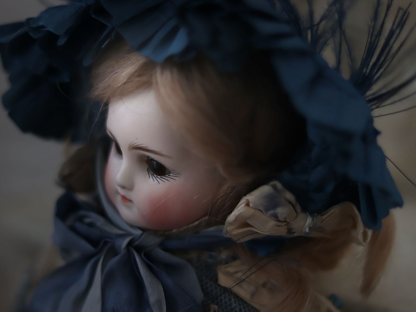 素敵なボネ、ドレス、ペチコート、シューズ、ピアス1個を身につけています。