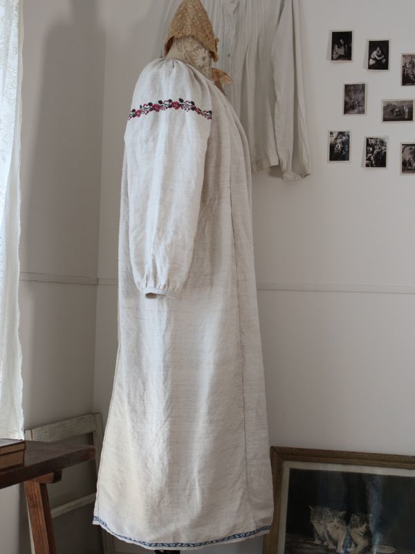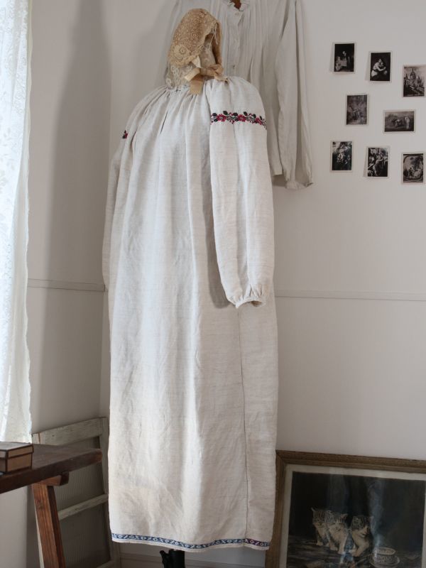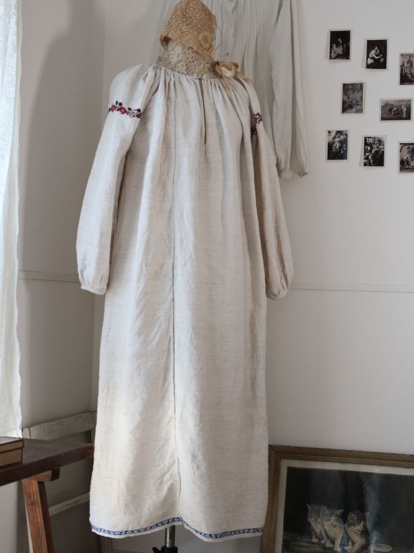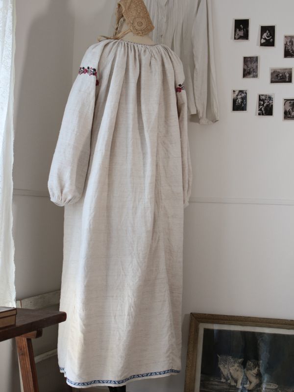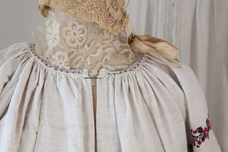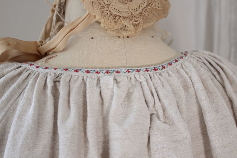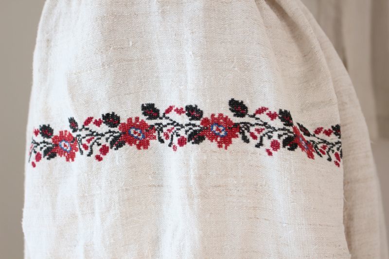 ネック周りは赤と青と緑の糸で可愛いお花の刺繍とステッチ、