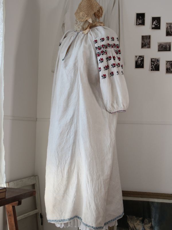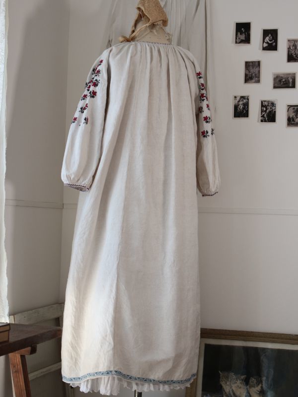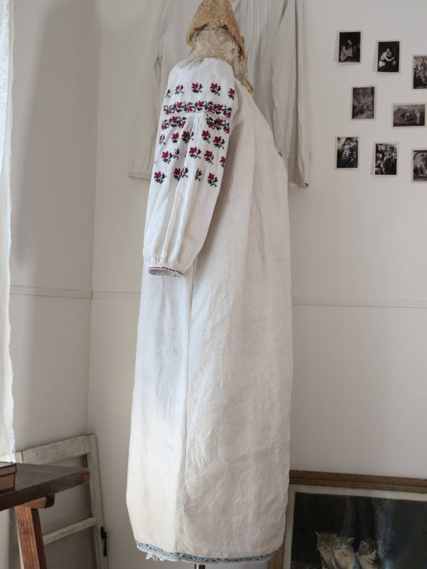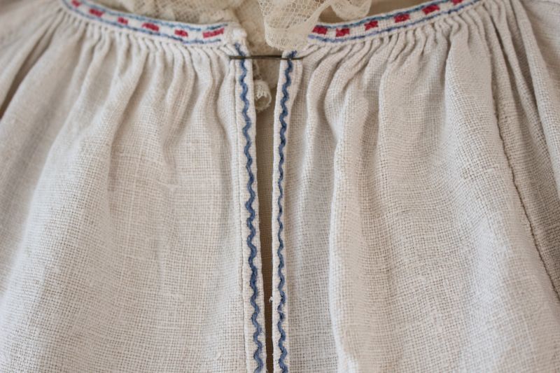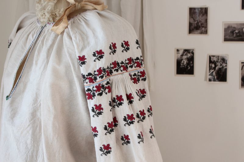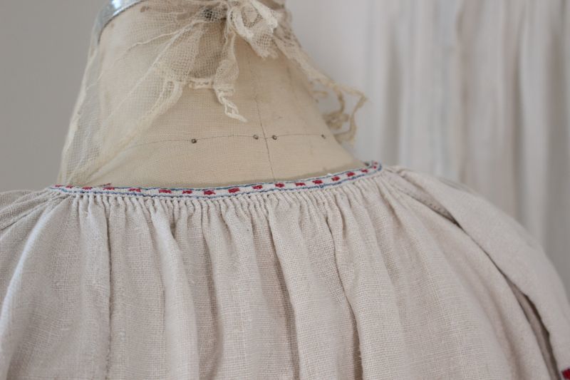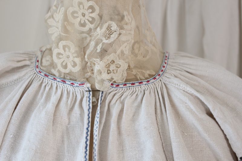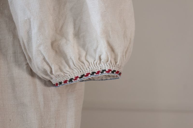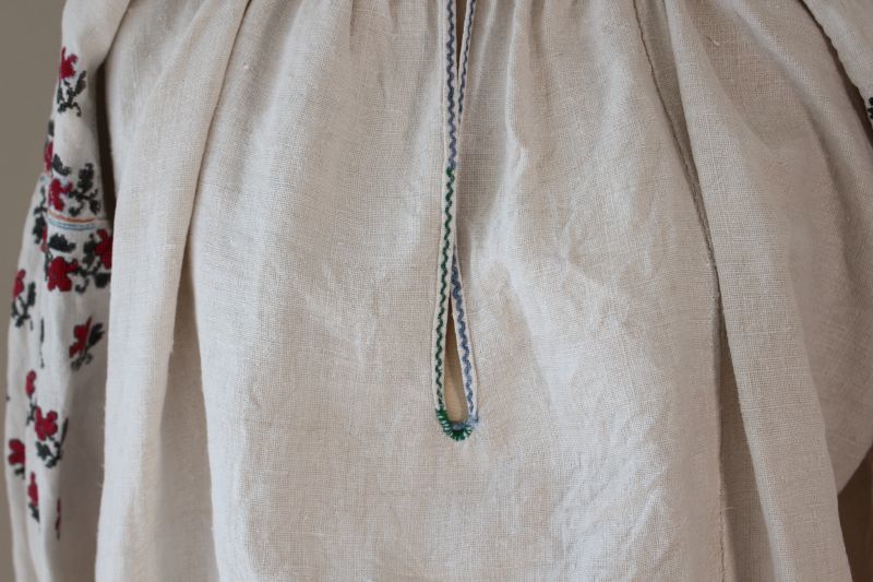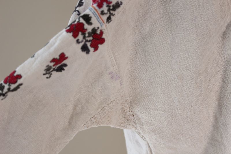 赤と深みのあるグリーンの糸でお花の刺繍が施されています。