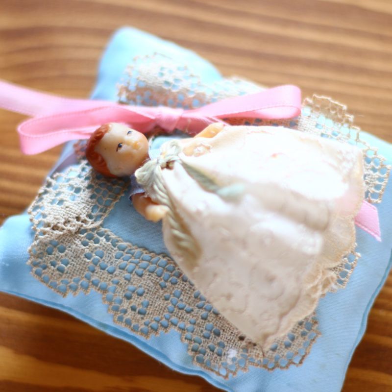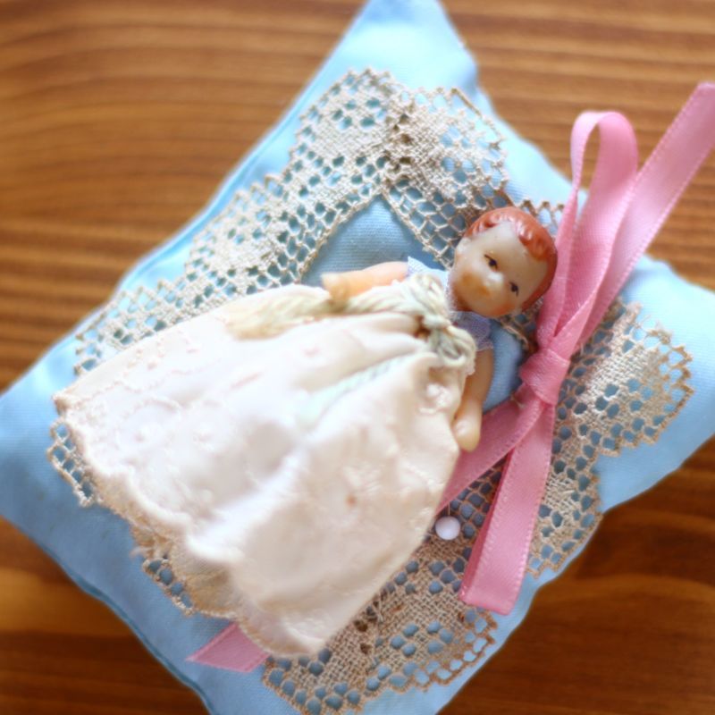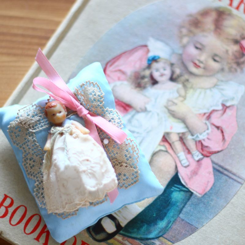 シルクの水色クッションにアンティークレースの